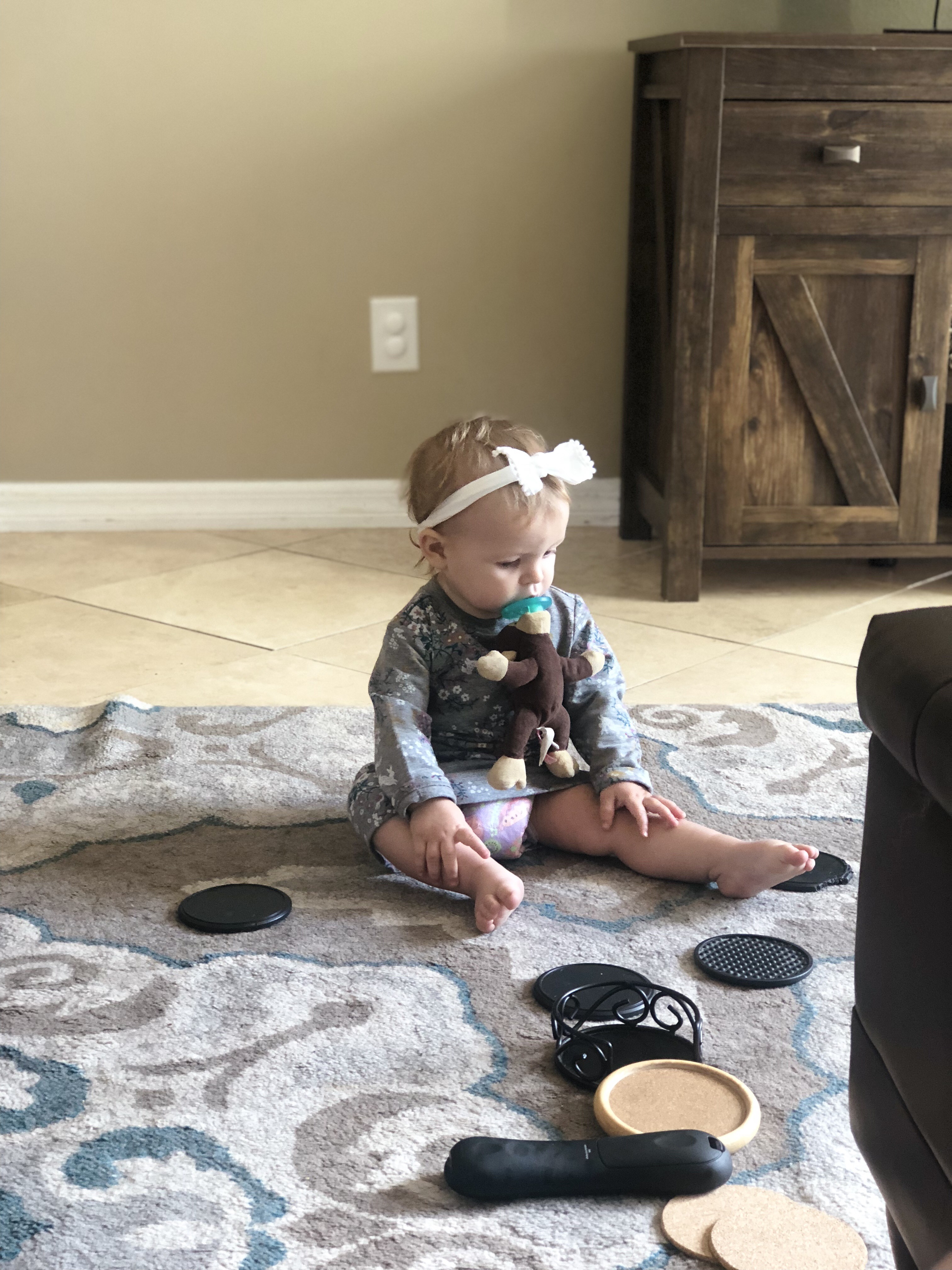 She is mimicking sounds and motions more and more and some are pretty entertaining. I make an “oooo ooo ooo” sound before I give her raspberries or tickle her so now when she wants to play she starts saying “oooo ooo ooo” to the same tune I do it! She also copies Daddy when he whistles. Home girl whistles better than I do! (And how did she figure that out?!?) She tries to open doors by the handle, “type” on computers and scrolls the phone with her finger. 🤦🏼♀️ When she got a fever after her shots she watched me take her temperature and then kept grabbing the thermometer and putting it on her own head. She loves to “clean” and takes paper towels and napkins and starts wiping things with them.