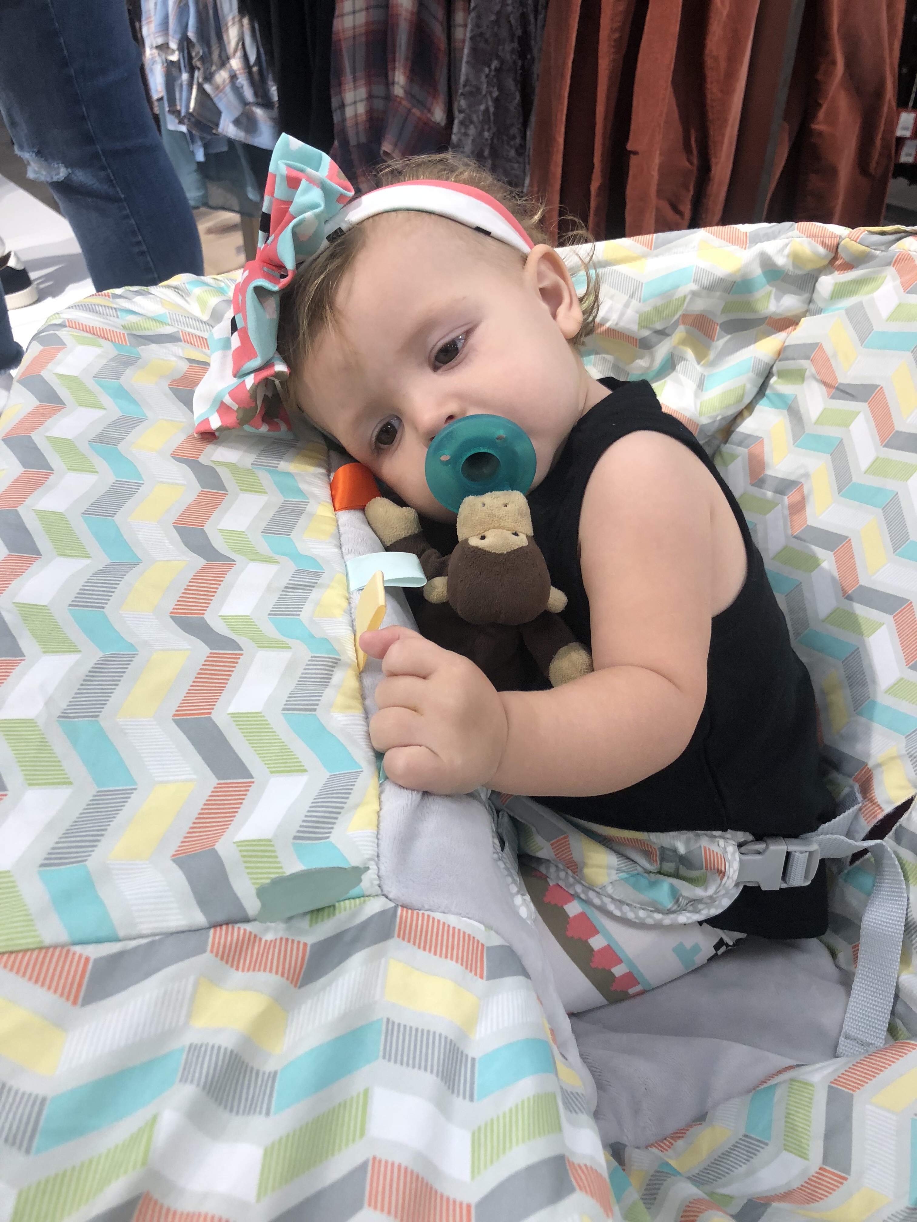 I brought her cart cover in since she can escape the buckles in the normal cart. Fun fact, she can also escape the buckle in this now. This kid is the Houdini of buckles. High chairs. Carts. Strollers. I was joking before, but I might actually have to get her a helmet.
