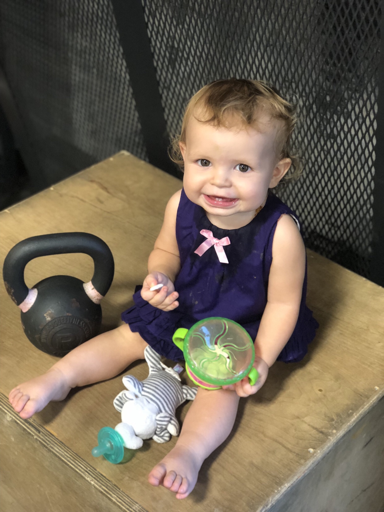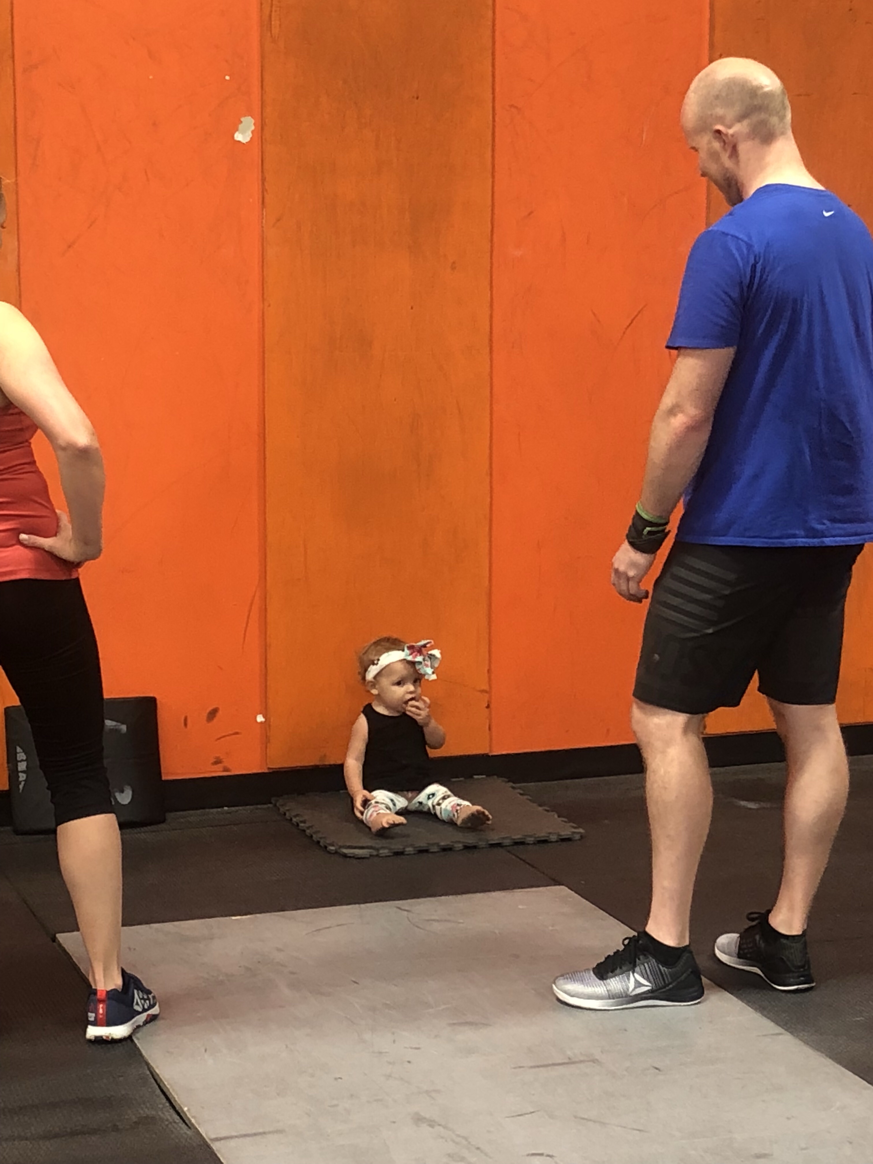 I scooped Kensie up so the class could get ready for the their workout. She has an obsession with sitting on the grey mats. Every time they’re down, she goes and sits on them. Right before I started the clock, Kensie waltzed over to Doug’s mats where he planned to do his handstand push-ups. She had other plans. 😂