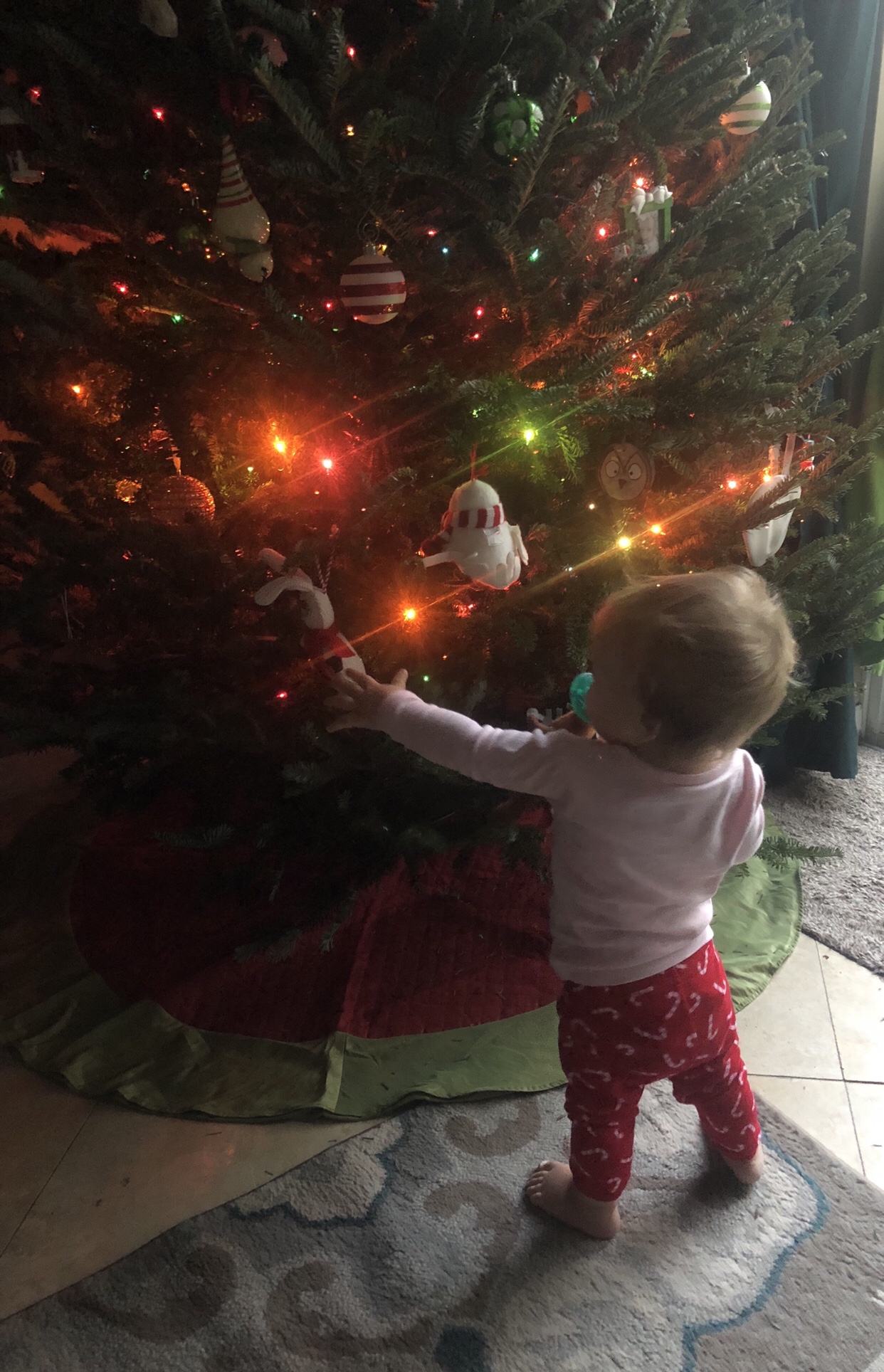 It’s not actually her first Christmas tree since I got her a pink one for her room last year – but I’m thinking now that she’s walking and grabbing and throwing that I might have to keep that one packed up this year. 😔