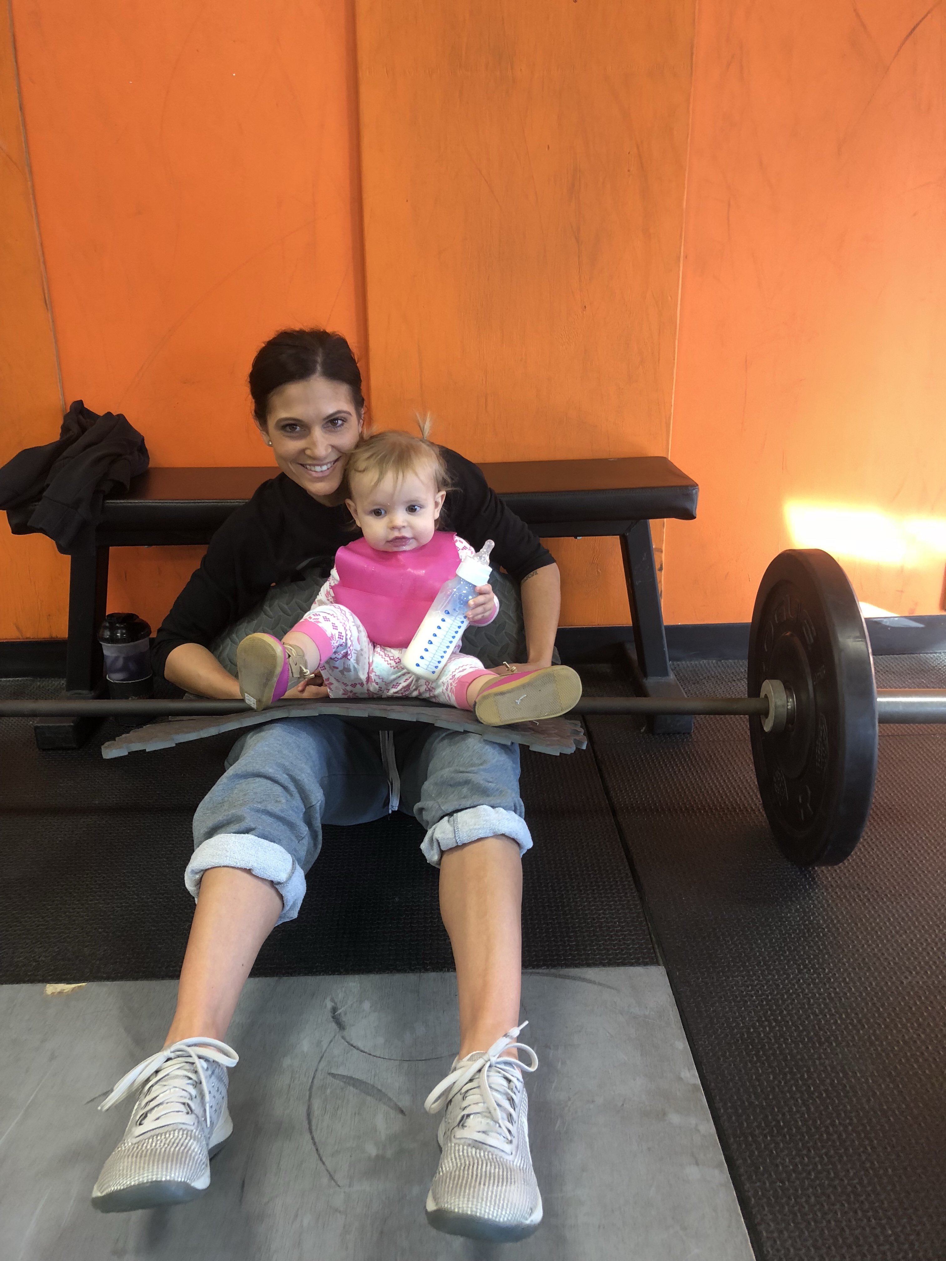 While we are on the gym topic, she’s also started copying everything people do, following them on runs, pulling on bars, turning the volume up and down on the speakers (oh joy), drinking out of any and every water bottle she can reach 🙄, and….sitting on everyone’s laps. (We all know she hated Santa’s lap. But sweaty people? She’s all about it!)