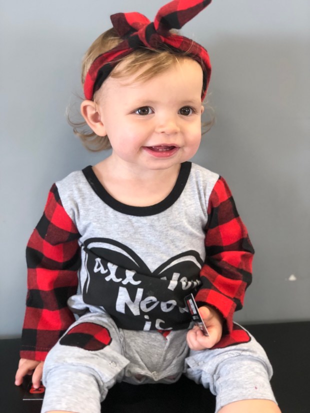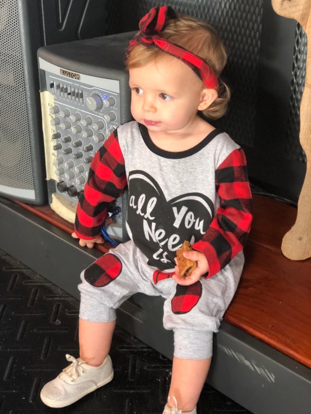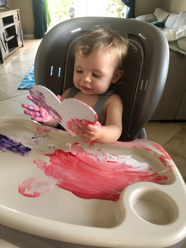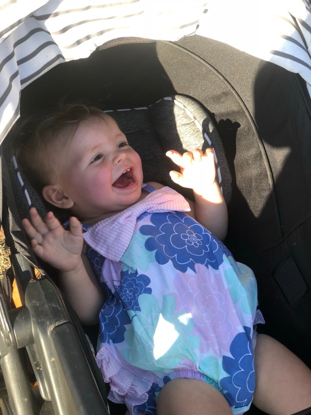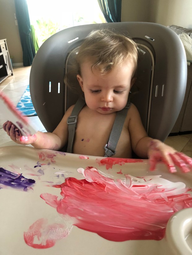 She says “dog”, “ack (jack)” and “cap (clap)” and “baby”. Kens is still obsessed with sign language and signs “more” and “all done” about 80 times an hour. If you ignore “more” she smacks her hands together really hard to make it LOUD sign language. 😂 If she’s eating she’ll also say “ah done!” Depending on her mood, she will say “ayter” if you tell her see ya later! K has a little Spanish flair for water and says “agua”. She recently started signing bird and dinosaur….because that’s useful. (Thanks Baby Einstein). Kens is FINALLY saying mama and starting to use it purposefully!