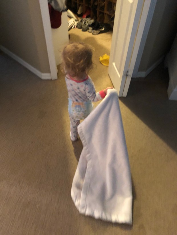She’s finally starting to have an attachment to something other than her pacifier. K won’t leave her crib now without grabbing her giraffe receiving blanket to come with her. She also likes carrying blankets around the house like Linus. Kens then proceeds to find random spots on the floor to lay down.