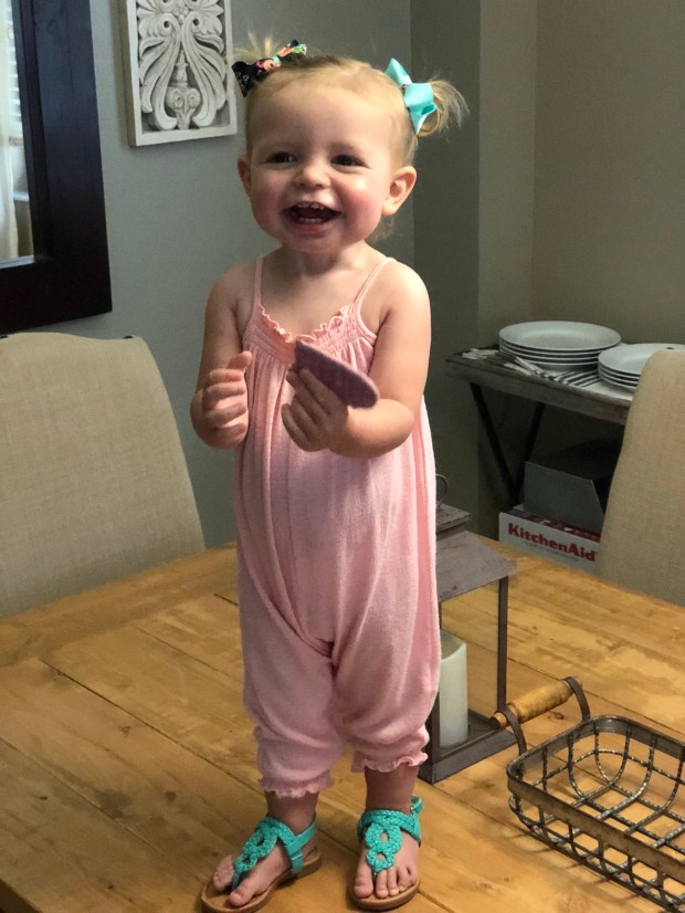 Kensie loves shoes, bags, hats and sunglasses. She loves her water table and the pool and basically anything I’ll let her do if she gets to hang out on the back patio.
