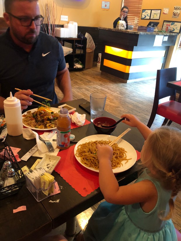 Leighton slept the evening away while her sister ran in the rain, jumped off benches and redecorated the restaurant.