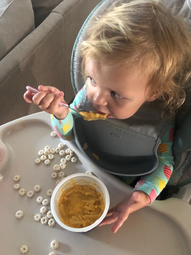 Speaking of eating, she’s been doing MUCH better and devours anything and everything at daycare. At home she’s very particular on what she wants and “no” means NO. If she says no and you give it to her – game over. Her favorite food is “chee-cheese” aka Mac n Cheese.