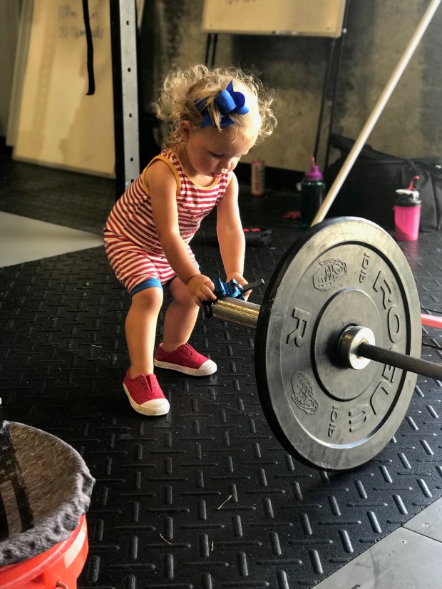 Watching KB at the gym may be the best part about this age. She mimics all the warm up movements, tries to do the workouts, does her own snatches, burpees and walllballs and puts her bar away with the real ones!